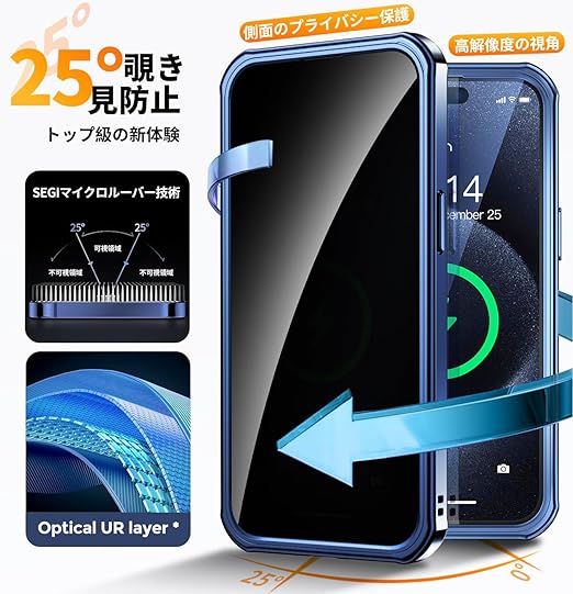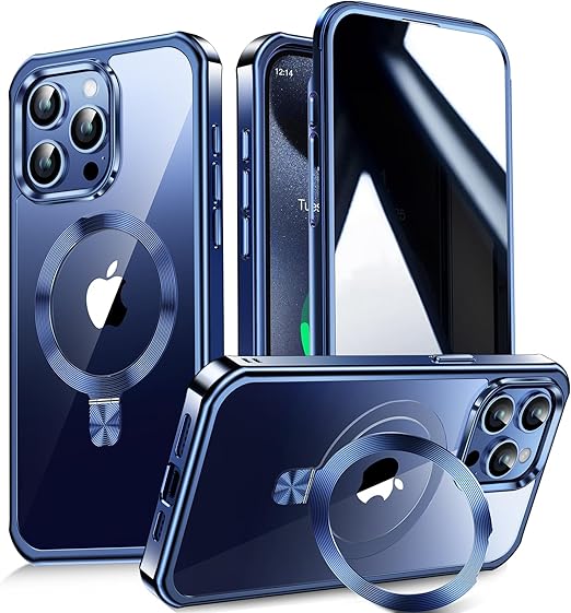 【多機能隠しスタンド・マグセーフ対応・覗き見防止】WTAIYUN iPhone 15 Pro Max 用 ケース 全面保護 CDリング 縦横両対応 ワイヤレス充電対応 米軍MIL規格 耐衝撃 高感度タッチ 両面 いphone15プロマックス カバー ストラップホール付き メッキバンパー PC背面 透明 黄変防止 アイフォン15promax ケース 6.7インチ(ブルー) a