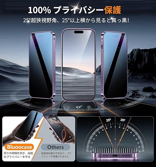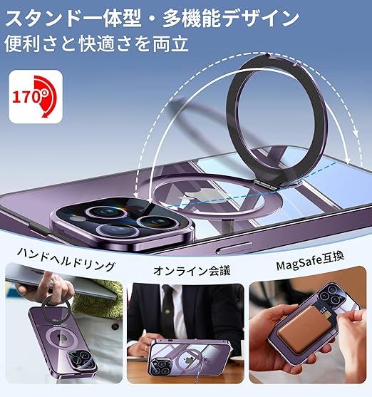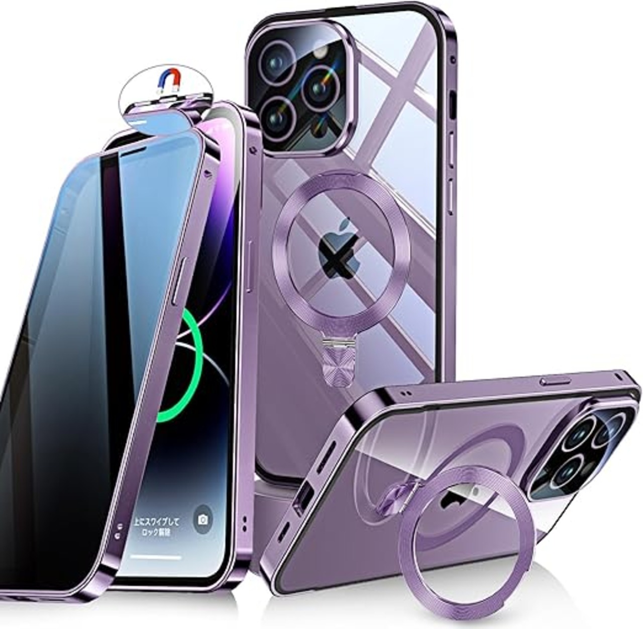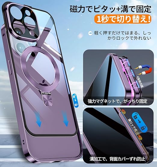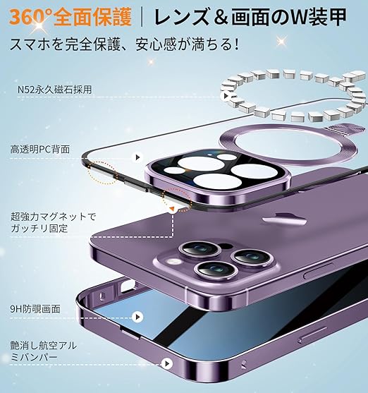 Bluoocase【磁石+溝二重自動ロック!3in1スタンド・覗き見防止】iPhone 14 Pro Max 用 ケース 全面保護 Magsafe対応・CDリング 縦横両立 アイフォン14プロマックス カバー 9H強化ガラス 両面 一体型レンズ保護 高感度タッチ ストラップホール付き 透明 PC背面 アルミバンパー いphone14pro max 用 携帯ケース 6.7インチ(ディープパープル) a
