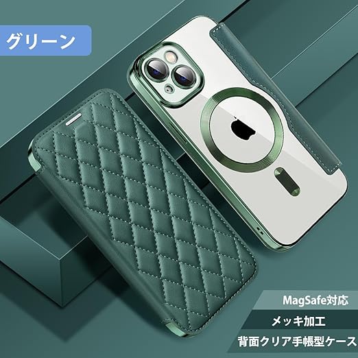 KeKeYou iPhone 13 用 ケース 手帳型 クリア Magsafe対応 背面透明 キルティング 高級なPUレザー スマホケース ゴージャス カード収納 おしゃれ 人気財布型 格子柄 カバー アイフォン13 用 手帳カバー ケース (iPhone 13,グリーン) a
