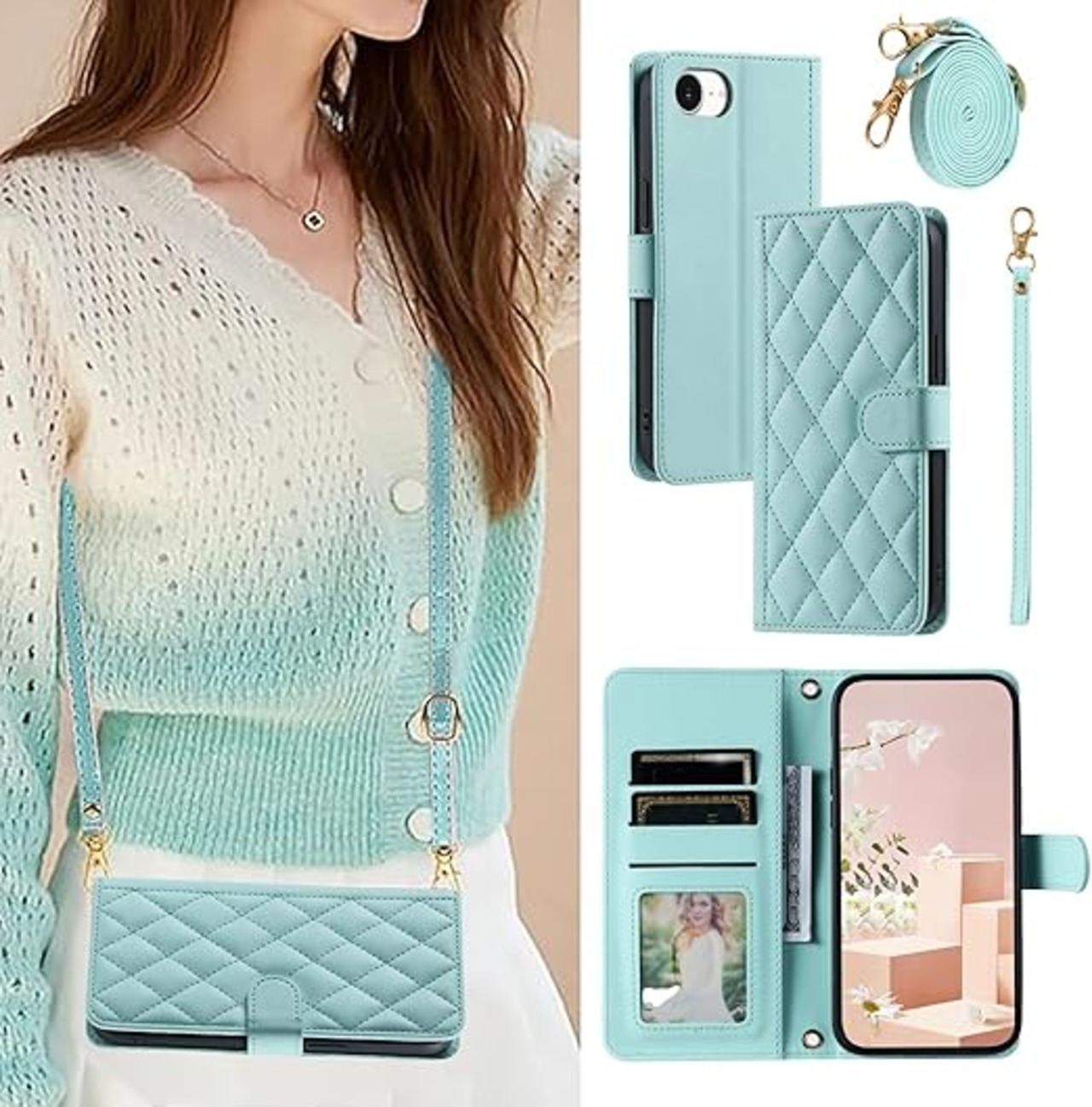 iPhone SE3 ケース 手帳型 第2世代 第3世代 iphone8 iphone7 財布型 ショルダー ストラップ カード収納 アイホンseケース アイフォン se スマホカバー 携帯電話ケース iphone se se2 カバー 肩掛け 斜め掛け スタンド機能 アイフォン8ケース アイホン7 カード iphoneSE 2020 全面保護 耐衝撃 おしゃれ 高級レザー - ミントグリーン a