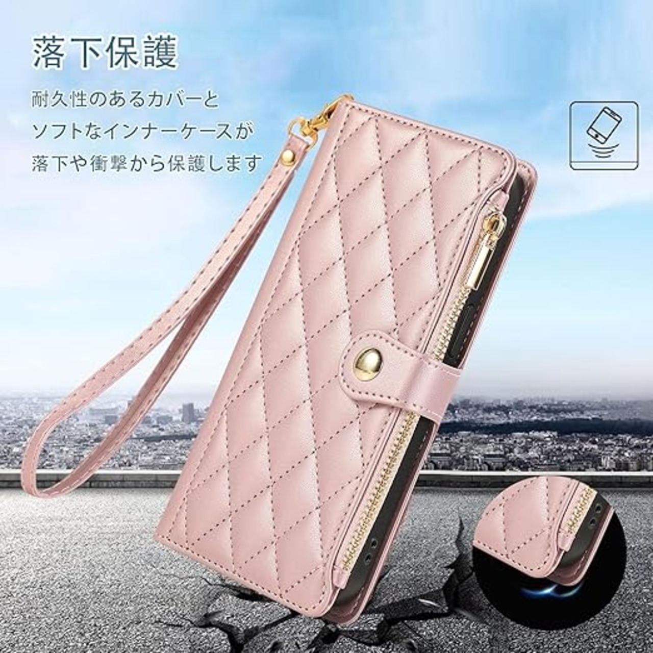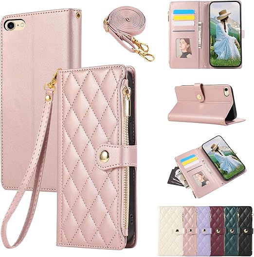 Yuotky for iPhone SE 第3世代 ケース 手帳型 通用 iPhone SE2, iPhone 6/7/8 カバー 対応 iPhone SE3 ケース ショルダー ひし形柄アイフォン SE カバー 肩掛け 人気 女性 カード収納 ジップ付き財布 横置き機能 シンプル お洒落 スマホケース (ローズピンク) a