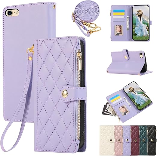 iPhone SE 第3世代 用 ケース 手帳型 通用 iPhone SE2, iPhone 6/7/8 カバー 対応 iPhone SE3 ケース ショルダー ひし形柄アイフォン SE ケース 肩掛け 人気 女性 カード収納 ジップ付き財布 横置き機能 シンプル お洒落 スマホケース (ミスティ・パープル) a