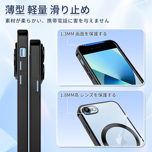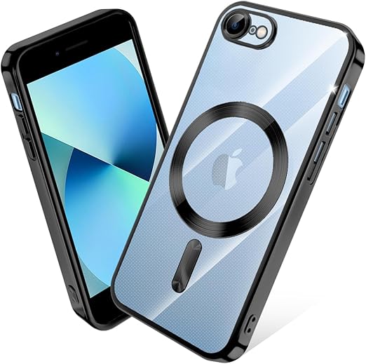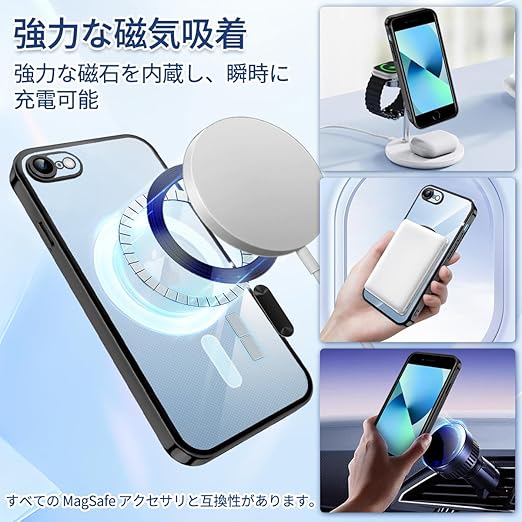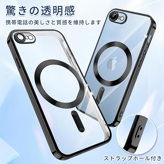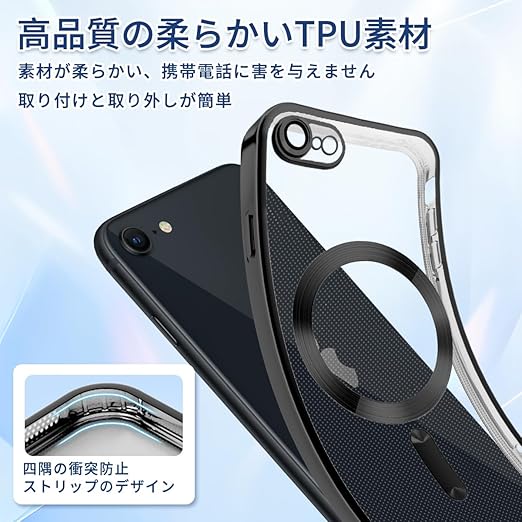 iPhone SE 第2世代 第3世代 ケース MagSafe対応 クリア iPhone 8 7 ケース メッキ加工 アイフォン SE3 SE2 スマホケース 耐衝撃 TPU ワイヤレス充電対応 いpほね se3/se2/8/7 カバー ストラップホール付き 薄型 透明 超軽量 黄ばみにくい 柔軟 滑り止め (ブラック) a