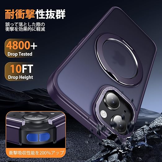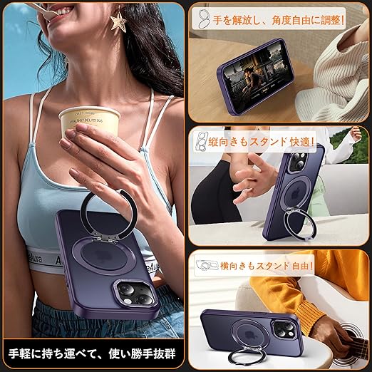 iPhone 14 / iPhone 13 用 ケース Magsafe対応 ワイヤレス充電 360°回転スタンド 縦横両対応 Gunwon スマホケース iphone14 / iPhone13 用 米軍規格 耐衝撃 半透明 マット感 マグセーフ 防指紋 リング マグネット搭載 アイフォン14/アイフォン13 用 カバー「パープル」 a