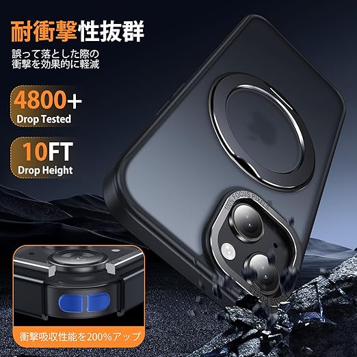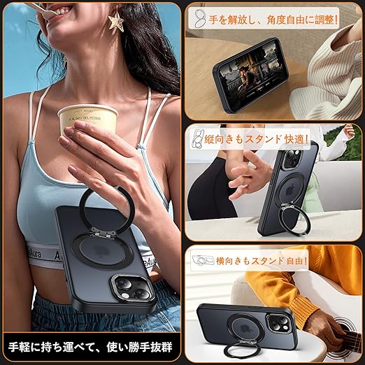iPhone 14 / iPhone 13 用 ケース Magsafe対応 ワイヤレス充電 360°回転スタンド 縦横両対応 Gunwon スマホケース iphone14 / iPhone13 用 米軍規格 耐衝撃 半透明 マット感 マグセーフ 防指紋 リング マグネット搭載 アイフォン14/アイフォン13 用 カバー「ブラック」 a