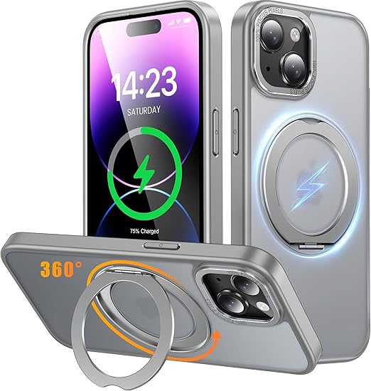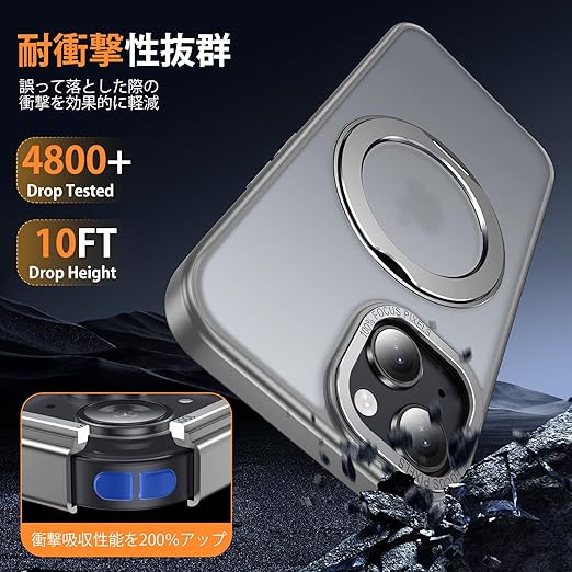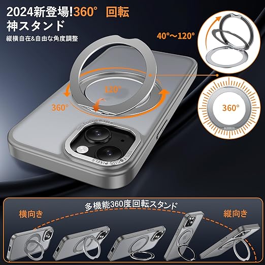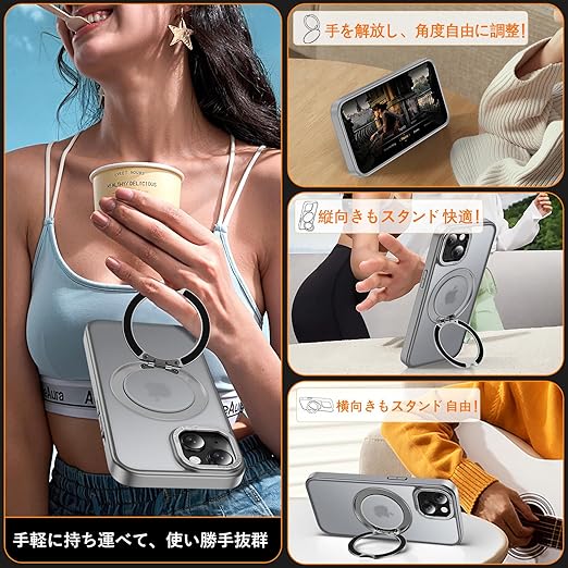 iPhone 14 / iPhone 13 用 ケース Magsafe対応 ワイヤレス充電 360°回転スタンド 縦横両対応 Gunwon スマホケース iphone14 / iPhone13 用 米軍規格 耐衝撃 半透明 マット感 マグセーフ 防指紋 リング マグネット搭載 アイフォン14/アイフォン13 用 カバー「グレー」 a