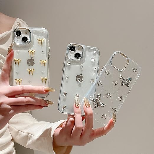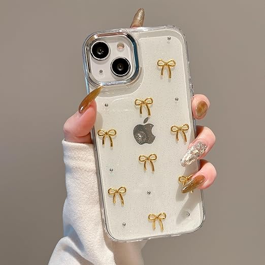 QLTYPRI iPhone14 ケース iPhone13 ケース クリア ゴールド ミニリボン おしゃれ 韓国 透明 可愛い 耐衝撃 スマホケース 立体 りぼん装飾 きらきら アイフォン13/14 ケース、ゴールド a