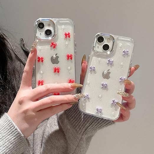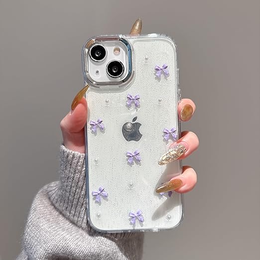 QLTYPRI iPhone14 ケース iPhone13 ケース クリア パープル ミニリボン おしゃれ 韓国 透明 可愛い 耐衝撃 スマホケース 立体 りぼん装飾 きらきら アイフォン13/14 カバー、パープル a