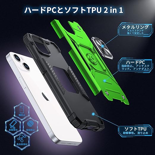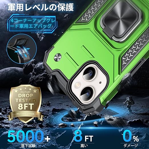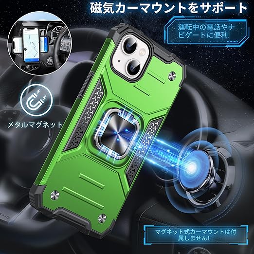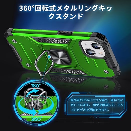 DASFOND iPhone 13 用 ケース 360度回転メタルリングキックスタンド付き 米軍MIL 耐衝撃 強化PCハードバック 傷つけ防止 スマホケース アイフォン13 カバー 6.1 インチ グリーン a