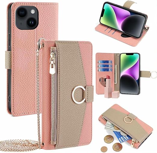 いphone14 ケース アイフォン14 ケース ショルダー ストラップ付き iphone 14 ケース スタンド機能 カード収納 ミラー付き 耐衝撃 肩掛け スマホケース iphone 14 手帳型 おしゃれ 女性 柔らかいTPU TOO&SOO アイフォン14 ケース 斜め掛け 適応 6.1 インチ - ピンク a
