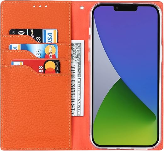 Eastwave アイフォン for iPhone 14 ケース 本革 牛革 for iPhone 14 ケース 手帳型 for iPhone14 カバー 手帳 本革 柔らかい 本皮 スプラットホール付き スプラット同梱 内蔵マグネット-オレンジ a