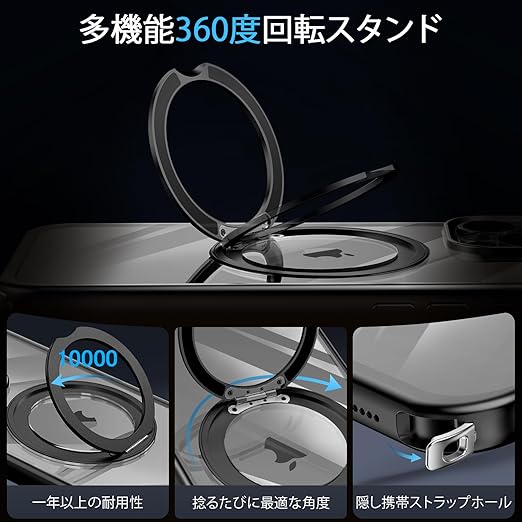 iPhone 14 Pro Max 用 ケース ダブルリング付き ショルダー ストラップ付き 多機能360度回転スタンド MagSafe対応 ワイヤレス充電対応 耐衝撃 薄型 透明 PC + 軽量 シリコン TPUバンパー おしゃれ スマホケース (ブラック, iPhone 14 Pro Max) a