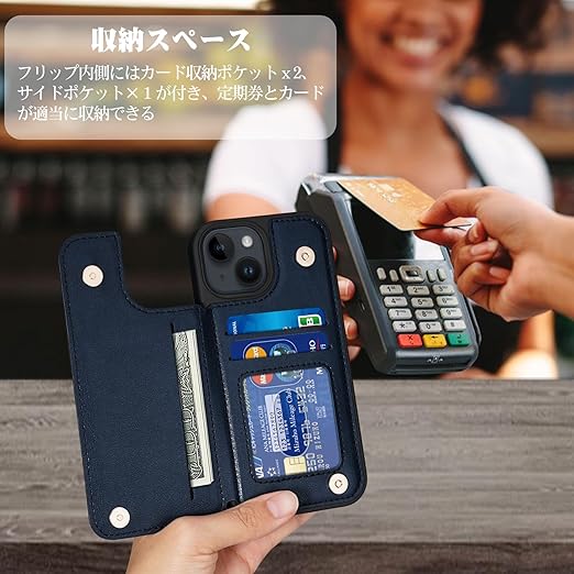 【便利性を極めた背面手帳型ケース】この背面手帳型ケースは、カード収納ポケットが便利に備わっており、数枚の定期券やカードを収納できます