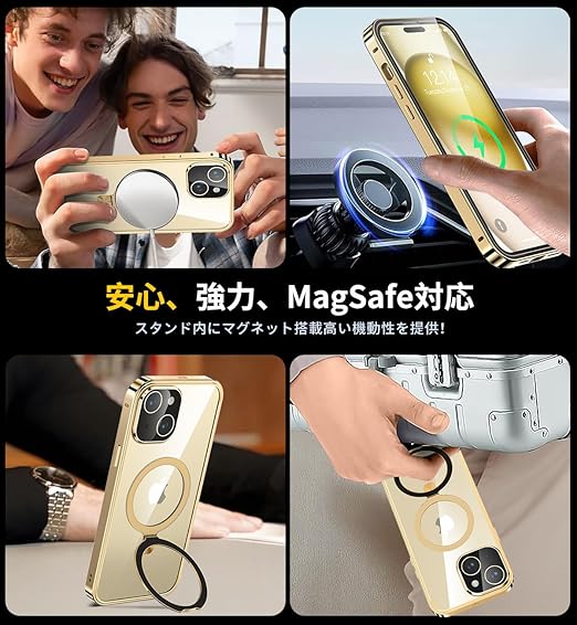 HGUTREY【スタンド機能付き・アクションボタン】 iPhone15 用 ケース クリア 【ロック付き】【CDリング・MagSafe対応】 9H強化ガラス PC背面 カメラレンズ保護 アイフォン15 カバー 両面 ストラップホール付き アルミバンパー メタルフレーム 耐衝撃 高感度タッチ ワイヤレス充電対応 アイホン15 用 ケース 6.1インチ(ゴールド) a