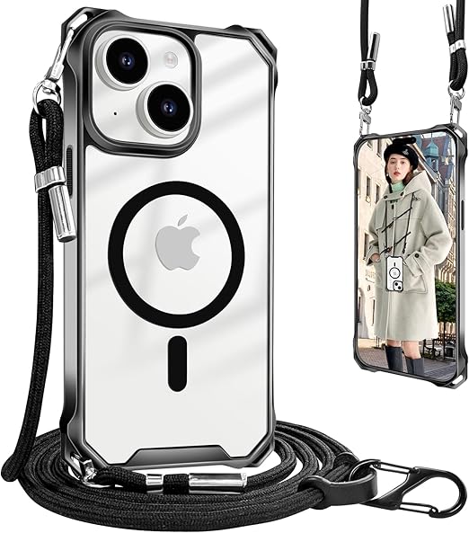 UnnFiko For iPhone 15 ケース クリア スマホケース ショルダー MagSafe対応 クリア マグネット式スマホケース アイフォン15 カバー 細いロープ 薄型 軽量 TPU 携帯ケース 紐付き ネックストラップ 斜めがけ ストラップ付き 長さ調整可能 取り外し可能 落下防止 ワイヤレス充電対応(iPhone 15,ブラック) a