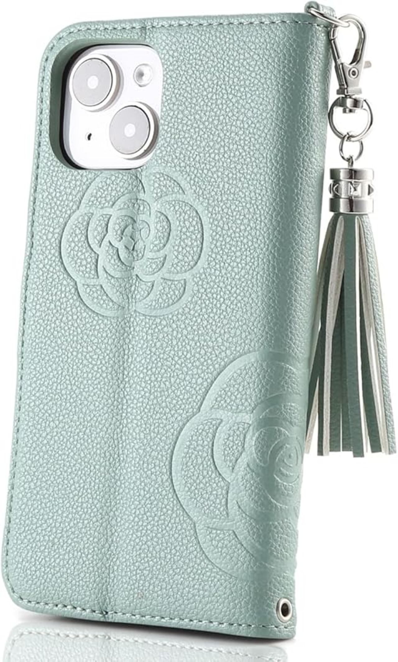 iPhone 15 / アイフォン 15対応。高品質の合皮レザーにシンプルなお花柄(カメリア)を型押し、シンプルなデザインに大人っぽいお洒落さを味わいます。さらに本体に揃うタッセルチャームを装着しております。各シーンに合わせて簡単に取り外します。肩掛けストラップ用穴と金具を搭載、ストラップ、キーホルダーやハンドストラップ(本製品ストラップが含めいません)も自由に付けます。