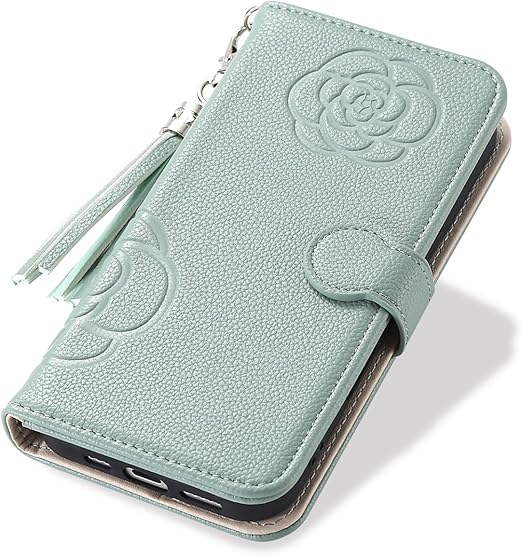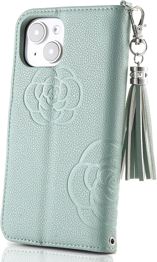 iPhone15 スマホケース 手帳型 お花柄 無地 グラスの鏡付き タッセルセット 女性かわいい Befortwo iPhone15 携帯ケース ポケット付き ストラップホール付き キーホルダー付け アイフォン15 スマホカバー 手帳型 マグネット式 使いやすい ソフトなTPU製カバー付き カード2枚入れ スタンド機能 落ち着いた色 ミラー付き グリーン a