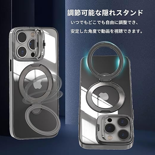 【チタニウム専用色&両スタンド】iPhone 15 Pro 用クリアケース [本体の色・メッキバンパー]ストラップホール付き [後ろスタンド・レンズスタンド]角度調整可 米軍MIL規格取得・耐衝撃 アイホン15 Pro 透明ケース スマホケース 人気 6.1インチ クリア チタングレー a