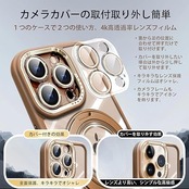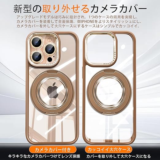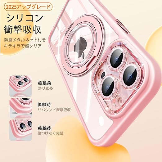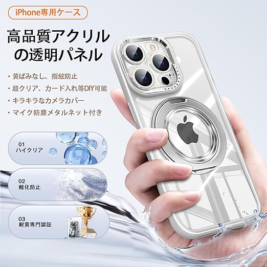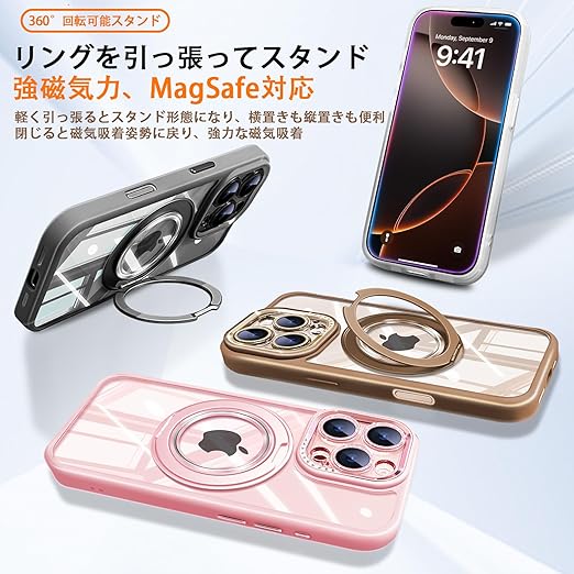 「製品仕様と特徴」対応機種:iPhone 15 Pro(アイフォン15プロ 6.1インチ)、製品サイズ:約15.2cm × 7.4cm× 1.1cm、重量:約0.08kg。特徴:360°回転スタンド、MagSafe対応超強い磁気、横置きにしても縦置きにしても自由に調整可能、リングスタンドにしてもiPhoneをしっかりホールドします。カメラカバーは自由に取付、取り外す設計、取付けるとレンズまで保護し、キラキラでオシャレなケースになる、カバーを取り外すとかっこいい大穴ケースになります。