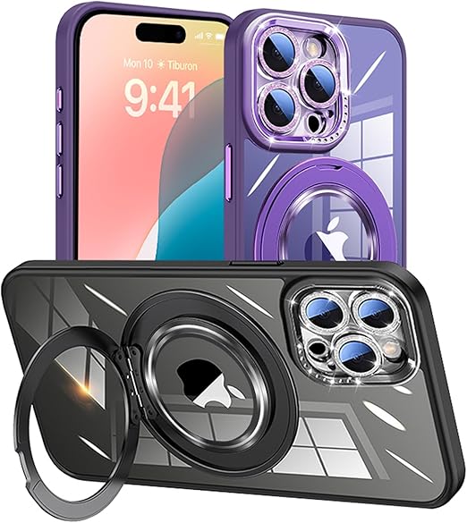 Damesine iPhone 15 Pro用ケース クリア 薄型MagSafe対応 360°マグネットリングスタンド シリコン耐衝撃 取付取外すキラキラなカメラカバーレンズ保護2 in 1 防塵ネット付き かわいいアイホン15プロケース ディープパープル a
