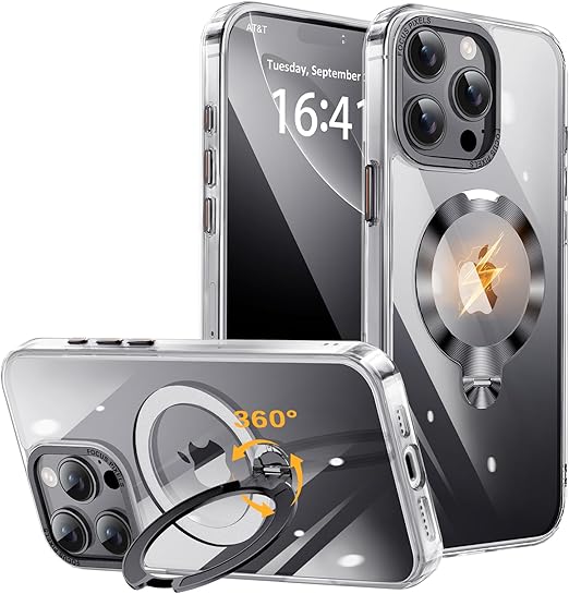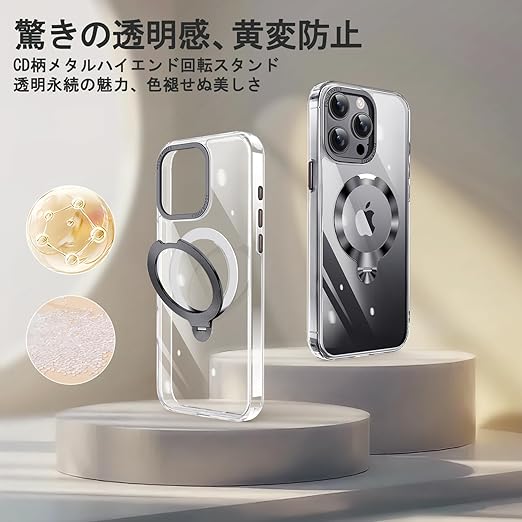 TISTUNST iPhone 15 Pro Max 用 ケース 透明 CDリング 【多機能 360°回転スタンド】【横縦両立・角度自由調整】搭載MagSafe対応 ワイヤレス充電対応 米軍MIL規格 耐衝撃 防指紋 黄変防止 レンズ保護 三眼 いphone15Pro Max 用 ケース 6.7インチ (ブラック) a