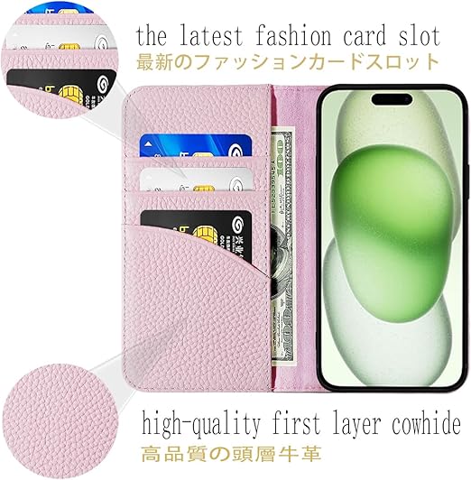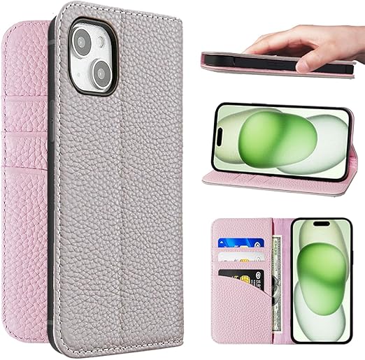 iPhone 15 Plus ケース 本革 手帳型 カバー 耐衝撃 保護 カバー 本革 内蔵マグネッ RFIDト 財布型 携帯カバー カードポケット スタンド機能 NanHou - グレー/ピンク a