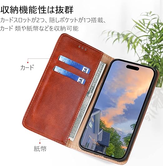 【多機能付き】iphone 15 Pro手帳型ケースは自由に調整できる横置きスタンド機能が付き、長時間の動画視聴でも手に持つ必要がなく。しかも、iPhone 15 Pro手帳ケース内側には二つのカード入れポケットがつき、置くことができますカード類や紙幣 、名刺などなど、普段の生活に便利をもたら