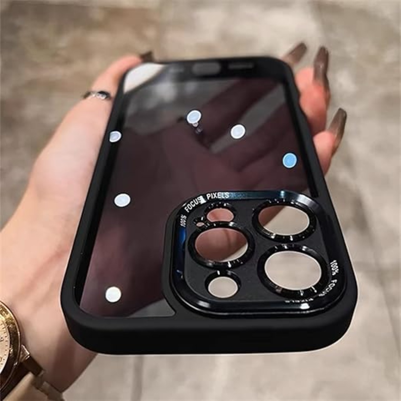背面が透ける特性を汲み取った透明デザインで、意図せず現れたiphone15 pro max 用の上品感が溢れている。さらに、透明+の二色構造で黄ばみの心配が一切なく、黄ばみ