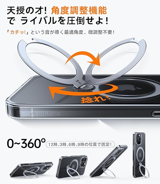 【カチッ!2024新開発・安定性】TORRAS iPhone 16 Pro Max 用 ケース ゼンマイ式スタンド 縦横両対応 リング マグネット搭載 MagSafe対応 ワイヤレス充電対応 米軍MIL規格耐衝撃 指紋防止 黄変防止 マグセーフ対応 6.9インチ いphone16pro max 用 ケース「Ostand Spin」クリア a