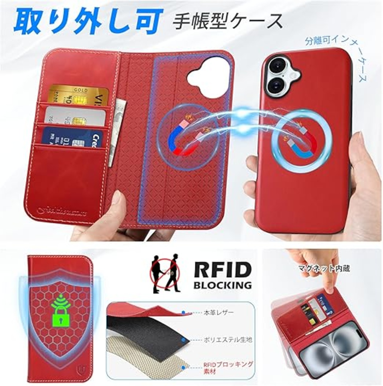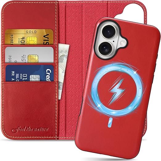 SHIELDON iPhone 16 対応手帳型ケース 2in1分離式 本革 取り外し自由 あいふぉん 16 携帯カバー 衝撃吸収 カード収納 横置きスタンド機能 マグネット内蔵 [RFIDブロッキング] 全面保護 アイホン 16 対応 スマホケース 2024年発売 6.1インチ対応 5G 2-in-1分離式 レトロレッド a