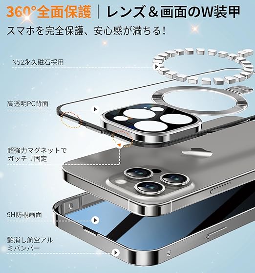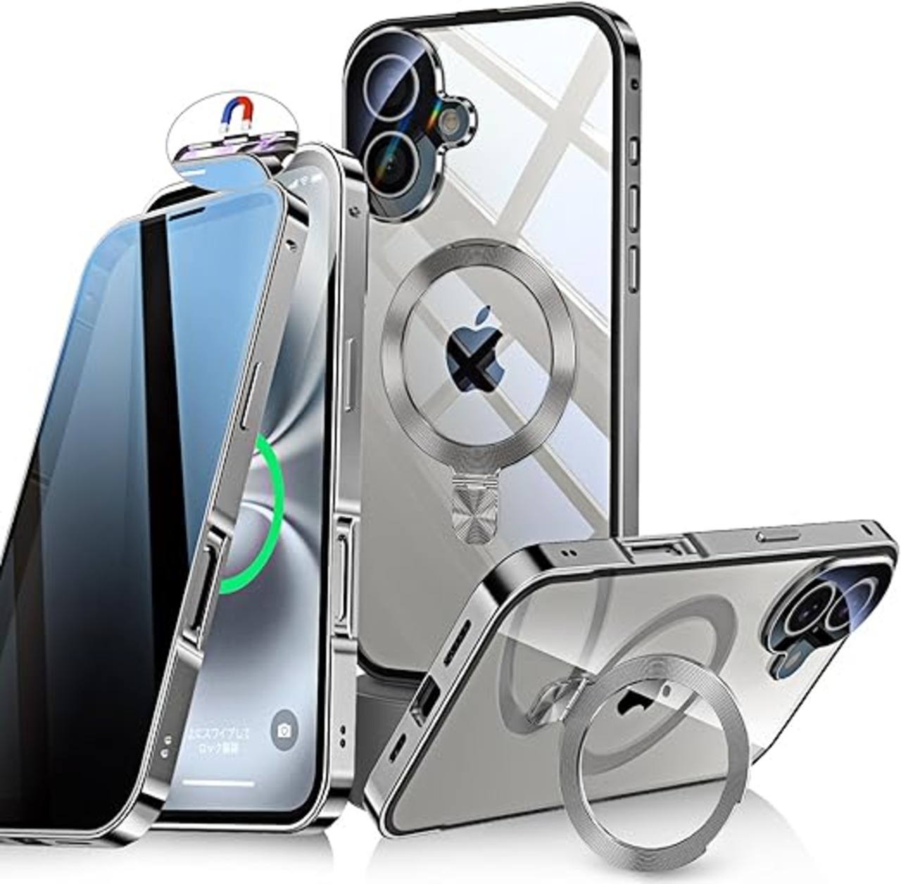 Bluoocase【磁石+溝二重自動ロック!3in1スタンド・覗き見防止】iPhone 16 用 ケース 全面保護 Magsafe対応・CDリング 縦横両立 アイフォン16 カバー 9H強化ガラス ワイヤレス充電 両面 一体型レンズ保護 高感度タッチ ストラップホール付き 透明黄変防止PC背面 指紋防止アルミバンパー いphone16 用 携帯ケース 6.1インチ(グレー) a