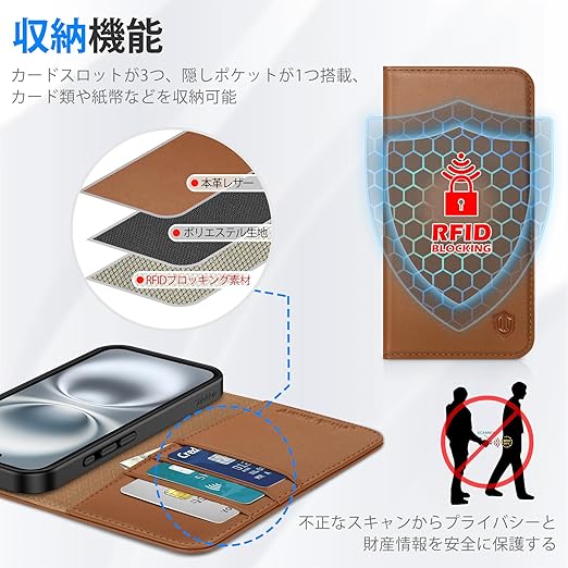【RFIDブロッキング技術採用・カード収納】本iPhone 16 Plusケースはカードスロット&ポケットの裏地につける布はRFIDブロッキングライニングを採用しています。先進的なRFIDブロッキング技術を利用して、信号をブロック