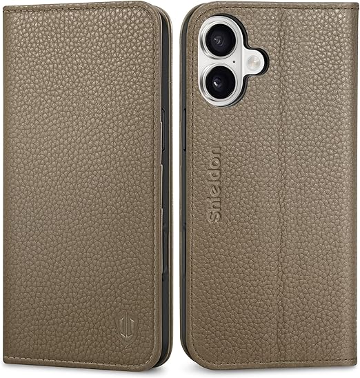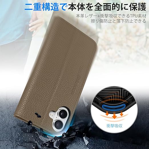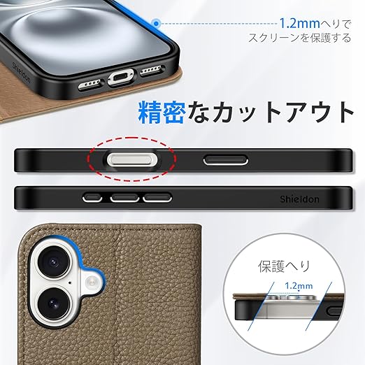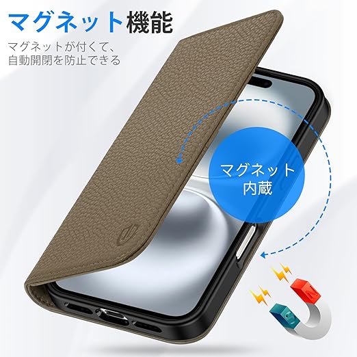 SHIELDON iPhone 16Plus 対応ケース 本革 手帳型 アイホン 16 Plus スマホカバー 衝撃吸収 TPU素材 カード収納 横置きスタンド機能 マグネット内蔵 [RFIDブロッキング] 全面保護 あいふぉん 16 プラス 対応 スマホケース 2024年発売 6.7インチ対応 5G ライチ紋カーキ a