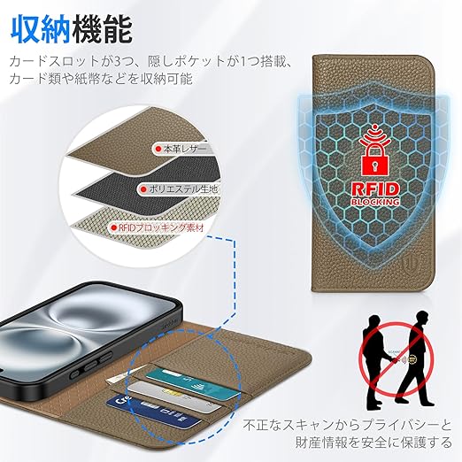 【RFIDブロッキング技術採用・カード収納】本iPhone 16 Plusケースはカードスロット&ポケットの裏地につける布はRFIDブロッキングライニングを採用しています。先進的なRFIDブロッキング技術を利用して、信号をブロ