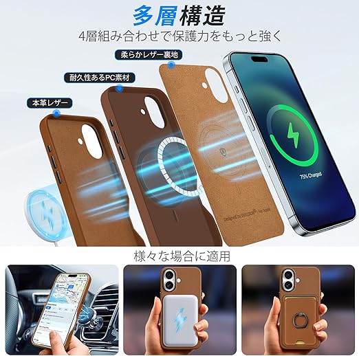 【iPhone16対応本革ケース・ワイヤレスと磁気充電可】本商品は本革レザー素材を採用したので、簡単に装着・脱着ができて、スマホ本体をしっかり保護します。軽量且つ極薄のデザインで、長時間スマホを使用しても熱がこもらないし、ワイヤレス充