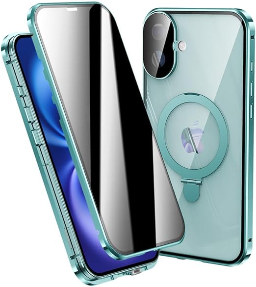 覗き見防止 iPhone 16 用 ケース MagSafe対応 ワイヤレス充電対応 全面カバー リング付き スタンド機能 一体型レンズ保護 ロック式 両面ケースマグネット式 強化ガラス アイフォン16 クリア ケース,グリーン a