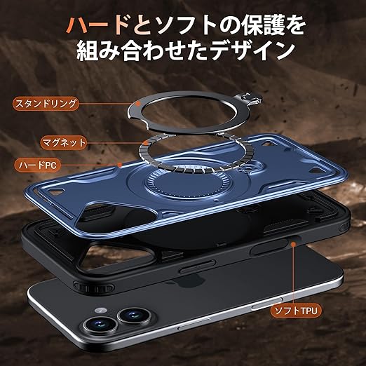 WYUIC 対応 iPhone 16 用 ケース [Magsafe 対応] 定点360° 回転 MILスペック 落下衝撃吸収 フルプロテクト 内蔵インビジブルスタンド付き 保護ケース ブルー a