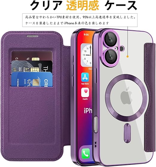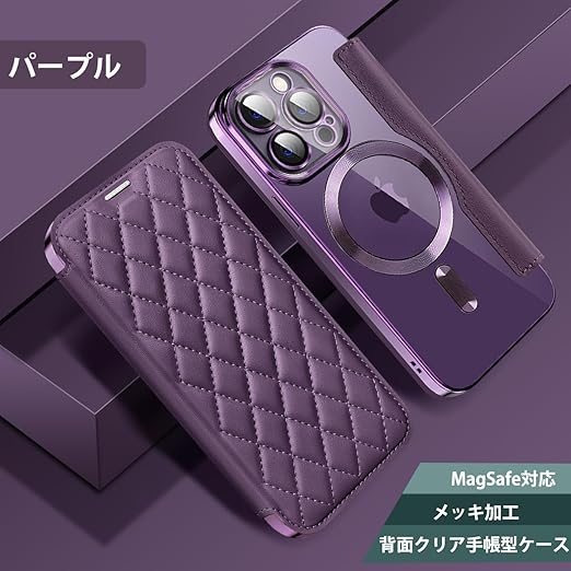 MuZiF iPhone 16 用 ケース 手帳型 Magsafe対応 クリア 背面 透明 キルティング 高級なPUレザー スマホケース カード収納 おしゃれ 韓国 人気財布型 カバー 軽量 アイフォン16 用 手帳カバー ケース (iPhone16用,パープル) a