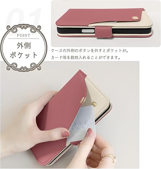 【カード収納&横置きスタンド機能】❶表面のボタン付きポケットが便利です。表のポケットの金具は飾りではなくスナップボタンで実用性があるし、内側に実用性のカード入れポケット×3、内側ポケット×1、カード類、現金、名刺、免許証入れなどを収納でき、通勤も通学にも楽々タイプです。❷水平ブラケット機能が付いてお