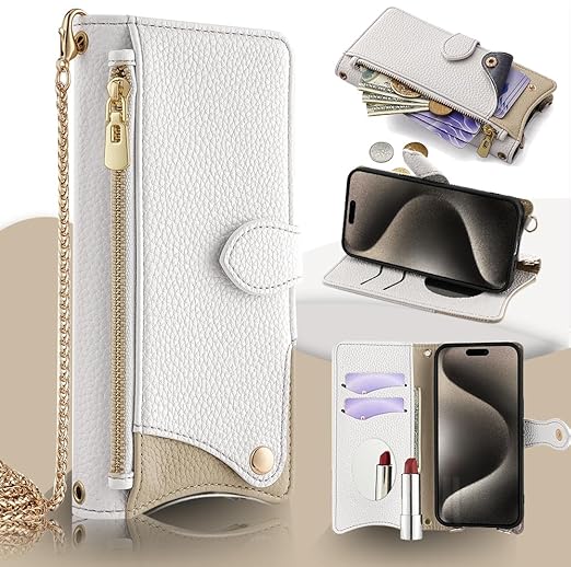 QANKISIS iphone16 ケース iphone 16 ケース 手帳型 鏡/ミラー付き 高級PUレザー マグネット式 スタンド機能 ストラップ付き 財布型 ショルダー 肩掛け 斜めがけ カバー 小銭入れ おしゃれ 横置 耐衝撃 全面保護 ポケットーホワイト a