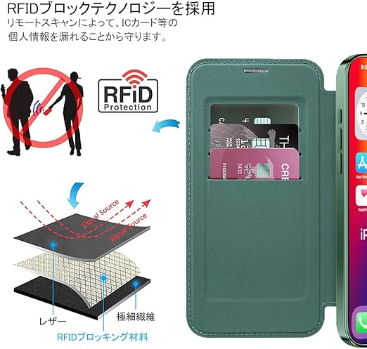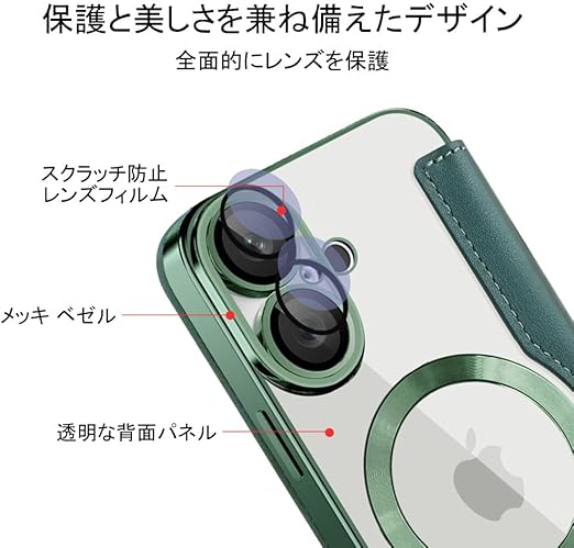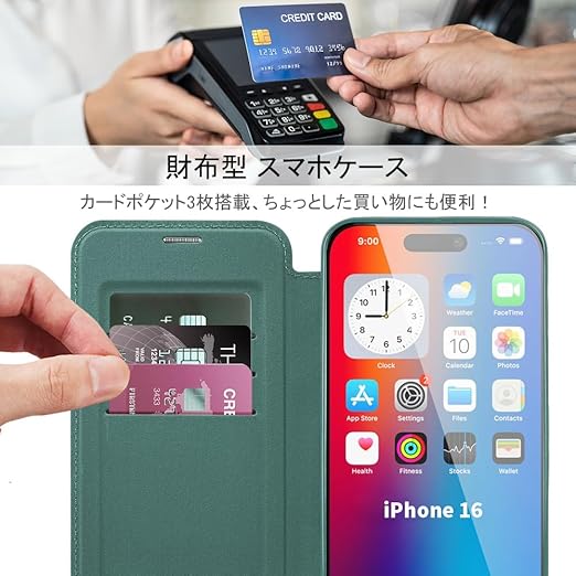【REHOOF】iPhone 16 ケース 手帳型 magsafe対応 6.1インチ 背面 透明 クリア 財布型 アイフォン 16 ケース マグセーフ 手帳 ワイヤレス充電対応 カード入れ PU革 レザー スマホケース 軽量 薄型 防塵 耐衝撃 全面保護 スマホカバー(グリーン) a