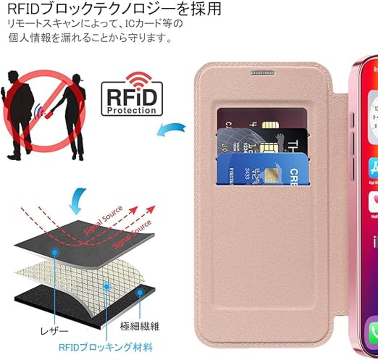 「カード収納」手帳型ケースの内側には3つのカードポ
