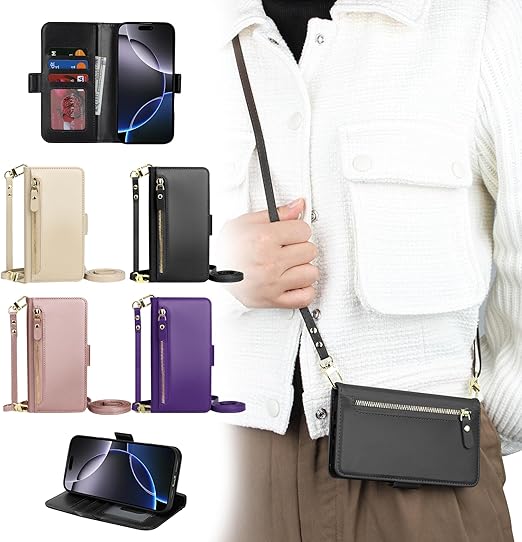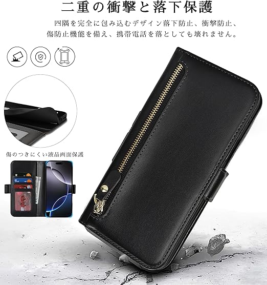 CLICSUN iPhone 16 ケース 手帳型 ショルダー いphone 16 斜めがけ ケース 財布型 携帯ケース アイフォン 16 肩掛け 小銭入れ カード収納ロングストラップ 長さ調節可能 衝撃吸収 ICカードホルダー PUレザー (ブラック) a