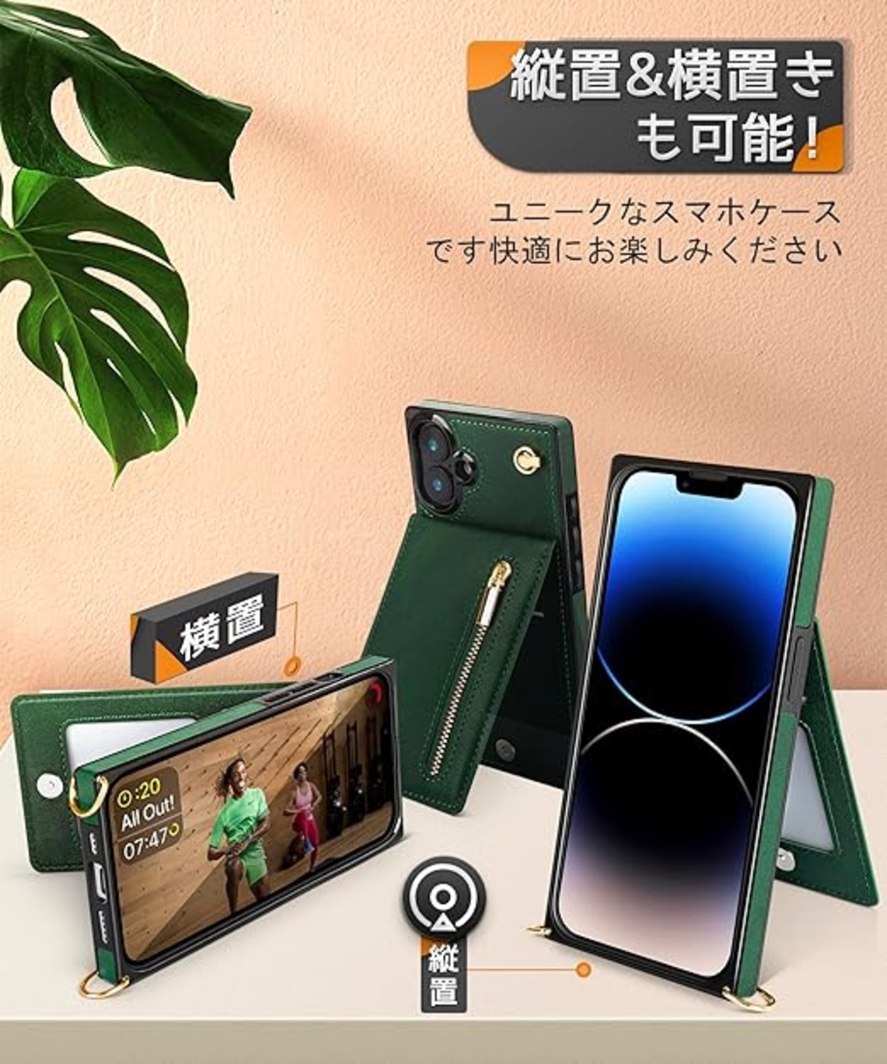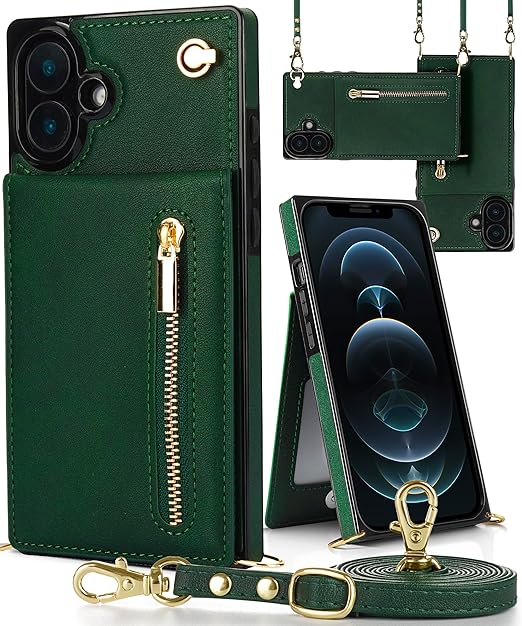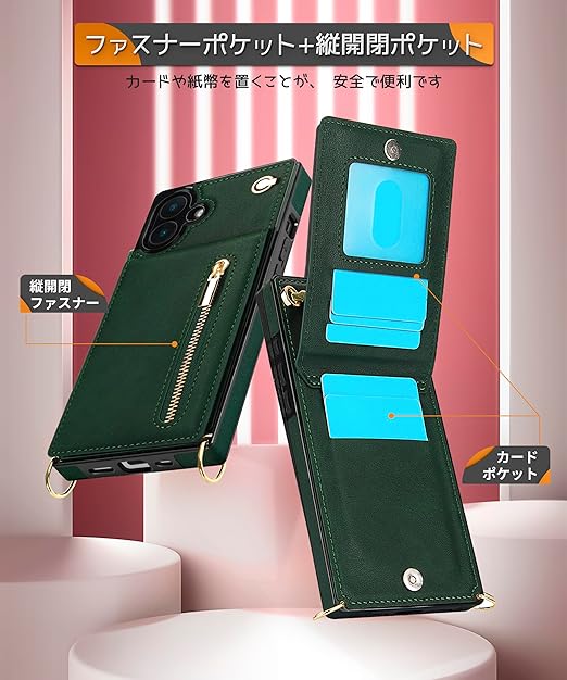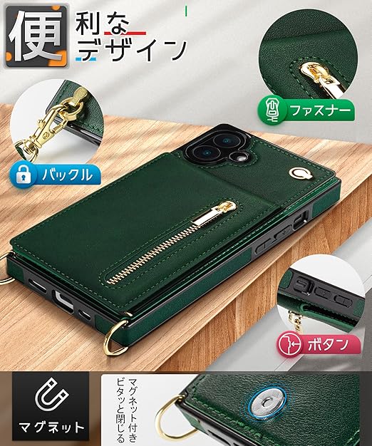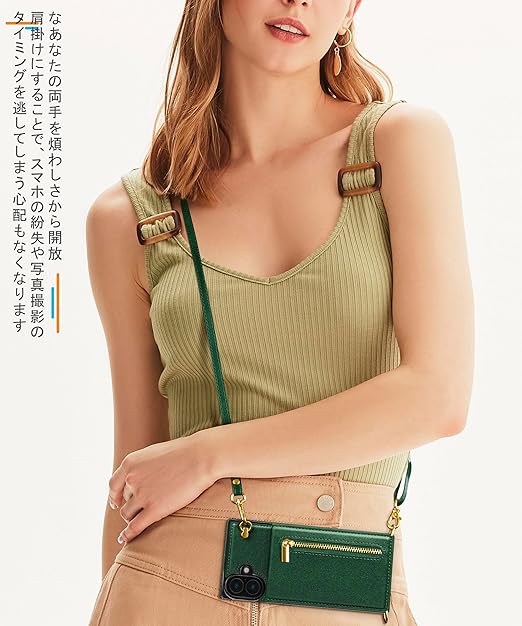 YIHARA iphone 16 ケース手帳型 iphone 16 スマホ ケース 財布型 iPhone 16 適用 携帯ケース 肩掛け 首かけ 斜めがけ ショルダー アイフォン16ケース手帳型 背面 カード収納 ストラップ付き 上下開 長さ調整可能 グリーン a