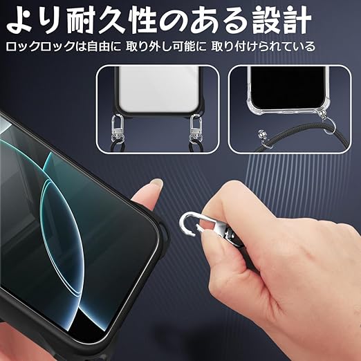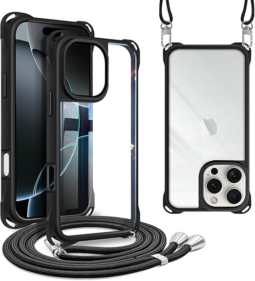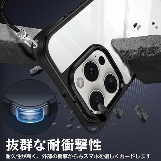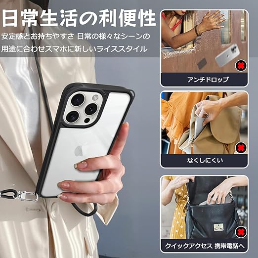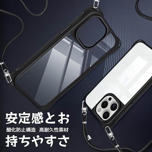iPhone 16 Pro 用 ケース ショルダー 縄掛け 首掛け 肩掛け ストラップ付き iPhone16Pro 用 カバー 紐付き 斜めがけ TPUバンパー 耐衝撃 薄型 軽量 黄ばみなし ハード ケース ブラック a