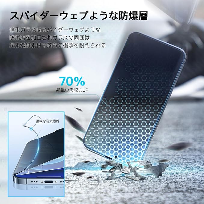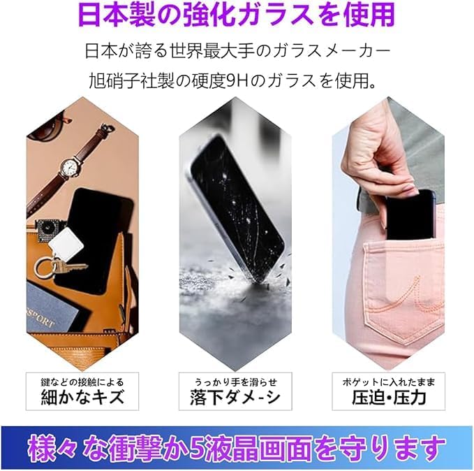 【9H硬度&飛散防止】高い硬度(9H)でキズや衝撃から画面をしっかり保護。万が一の破損時にも飛散を防止し、安全性を高めます。