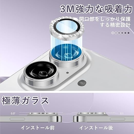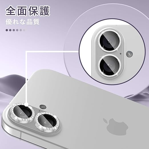 対応機種:用の Phone 16 対応/用の Phone 16 Plus 対応カメラレンズ保護フィルムです。アルミニウム合金と強化ガラスの組み合わせます。最高な保護力を提供しています。擦り傷や衝撃からカメラレンズをしっかりと守られます。高い透明度のガラス素材を精巧にカットしたラインストーンを使用。太陽や、街頭、車のライトに反射して魅力的な光を放ちます。ご購入前、ご設備のモデル番号をご確認ください。