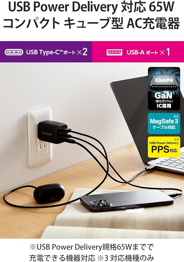 ※USB Power Delivery規格65Wまでで充電できる機器に限ります。