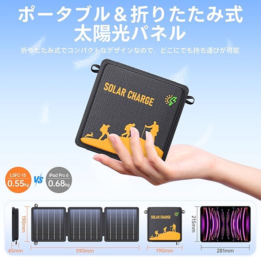 ソーラーパネル 15W USB-C(5V/3A) 23%高交換効率 ソーラーチャージャー ETFE材質 折りたたみ式 パネル1枚につき5 W 超薄 IP65 防水防塵 ソーラー充電器 スマホ充電器 ハイキング/災害時にも最適 持ち運び便利 Phone/Pad/Android各機種対応 緊急停電対策 a