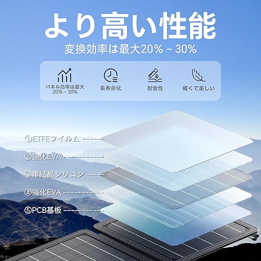 【超小型・超軽量】この折りたたみ式ソーラーパネルの重さはわずか550gです。 A4用紙の半分の大きさで、重さは500mlの水のボトルより軽いです。軽量設計なので持ち運びやすく、バックパックや緊急キットに簡単に収まります。コンソールには収納ポケットも付いており、充電中にケーブルやスマートフォンなどの付属品をきちんと収納できます。折り畳み後のサイズはわずか190*190*45mmです。